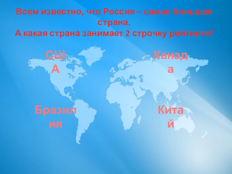 Всем известно, что Россия – самая большая страна.А какая страна занимает 2 строчку рейтинга?СШАКанадаБразилияКитай