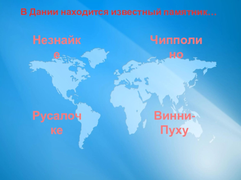 В Дании находится известный памятник…НезнайкеВинни-ПухуРусалочкеЧипполино