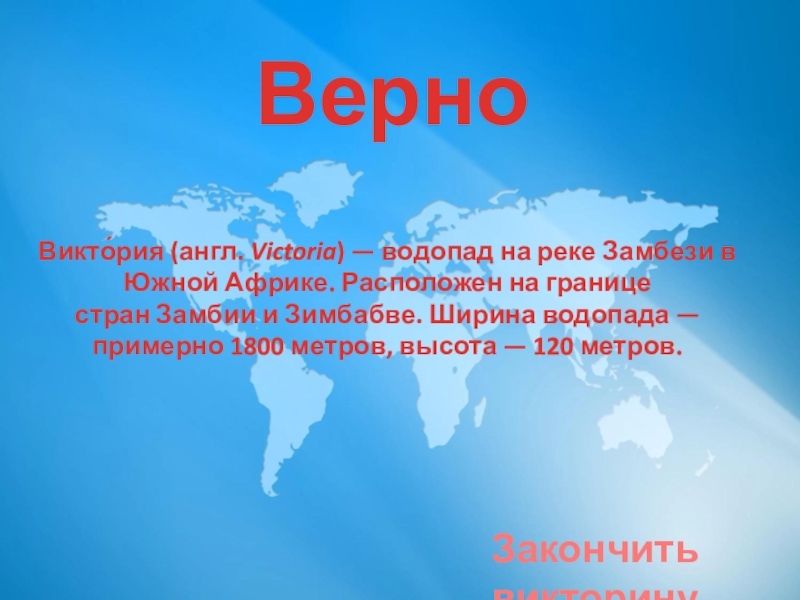 ВерноЗакончить викторинуВикто́рия (англ. Victoria) — водопад на реке Замбези в Южной Африке. Расположен на границе стран Замбии и Зимбабве. Ширина водопада — примерно 1800 метров, высота — 120 метров.