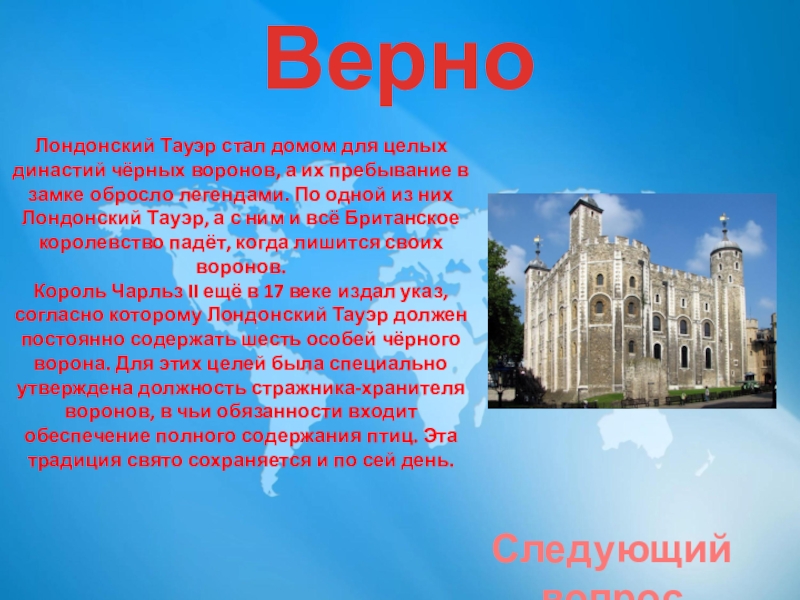ВерноСледующий вопросЛондонский Тауэр стал домом для целых династий чёрных воронов, а их пребывание в замке обросло легендами.
