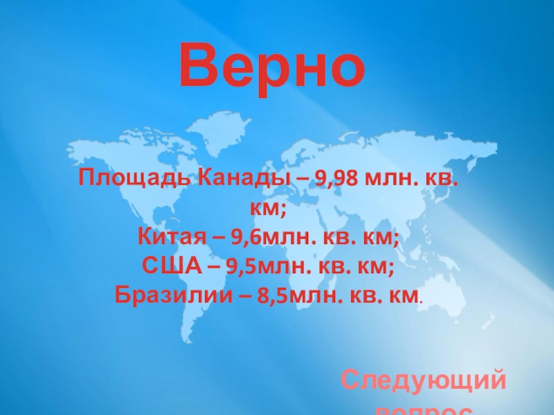 ВерноСледующий вопросПлощадь Канады – 9,98 млн. кв. км; Китая – 9,6млн. кв. км; США – 9,5млн. кв.