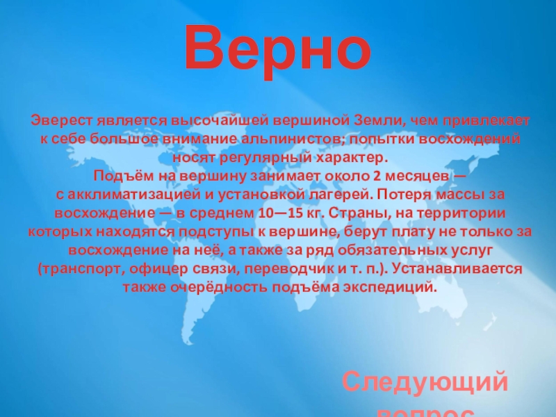 ВерноСледующий вопросЭверест является высочайшей вершиной Земли, чем привлекает к себе большое внимание альпинистов; попытки восхождений носят регулярный характер.Подъём