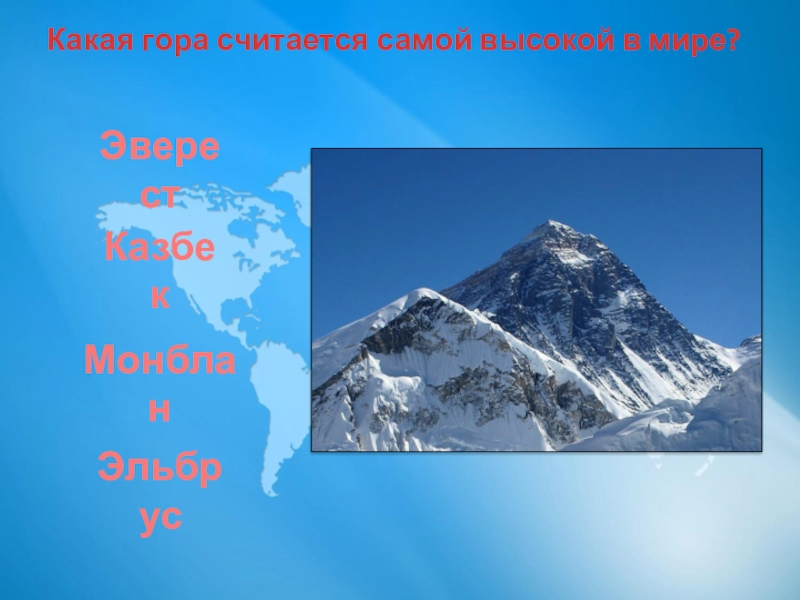 Какая гора считается самой высокой в мире?КазбекЭверестМонбланЭльбрус