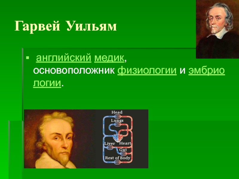 Гарвей Уильям английский медик, основоположник физиологии и эмбриологии.