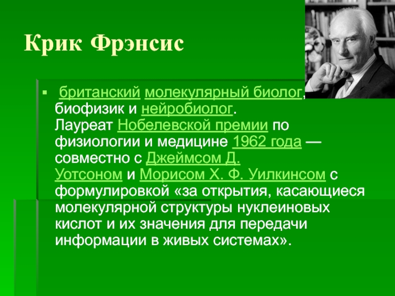 Крик Фрэнсис британский молекулярный биолог, биофизик и нейробиолог. Лауреат Нобелевской премии по физиологии и медицине 1962 года — совместно с Джеймсом Д. Уотсоном и Морисом Х. Ф. Уилкинсом с формулировкой