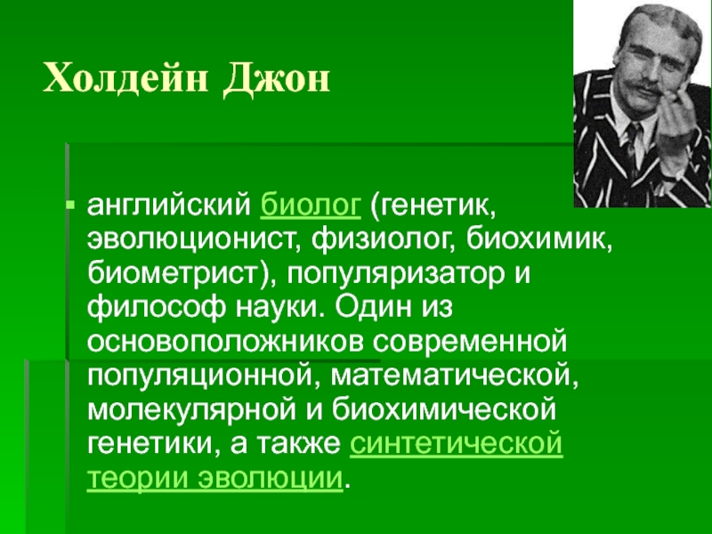 Холдейн Джонанглийский биолог (генетик, эволюционист, физиолог, биохимик, биометрист), популяризатор и философ науки. Один из основоположников современной популяционной, математической, молекулярной