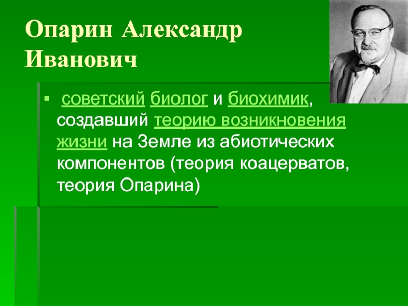 Опарин Александр Иванович советский биолог и биохимик, создавший теорию возникновения жизни на Земле из абиотических компонентов (теория коацерватов, теория Опарина)