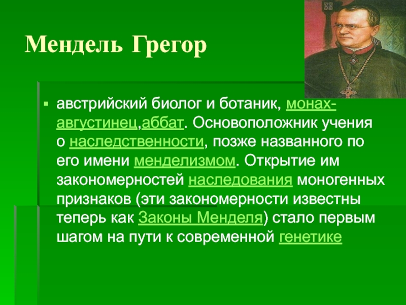 Мендель Грегоравстрийский биолог и ботаник, монах-августинец,аббат. Основоположник учения о наследственности, позже названного по его имени менделизмом. Открытие им закономерностей наследования моногенных признаков