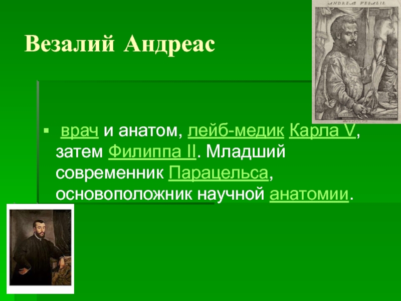 Везалий Андреас врач и анатом, лейб-медик Карла V, затем Филиппа II. Младший современник Парацельса, основоположник научной анатомии.