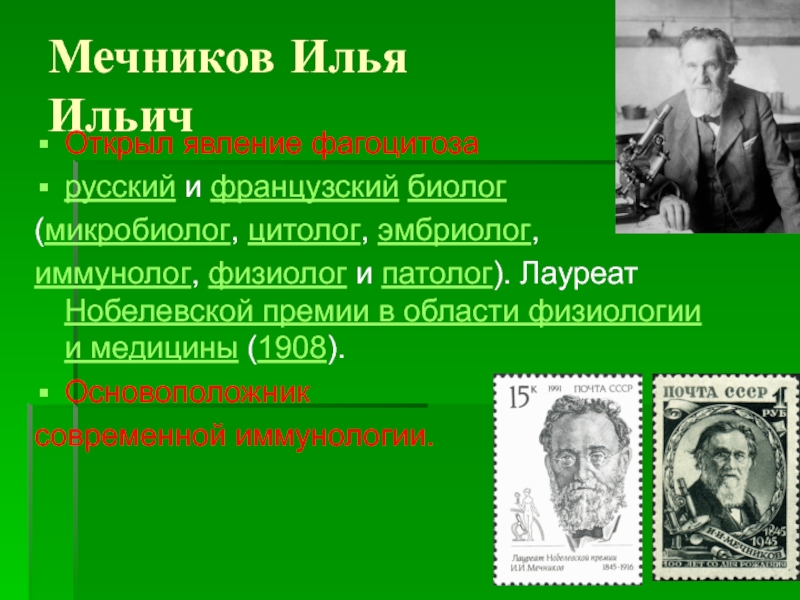 Мечников Илья ИльичОткрыл явление фагоцитозарусский и французский биолог (микробиолог, цитолог, эмбриолог, иммунолог, физиолог и патолог). Лауреат Нобелевской премии в области физиологии и медицины (1908). Основоположник современной иммунологии.