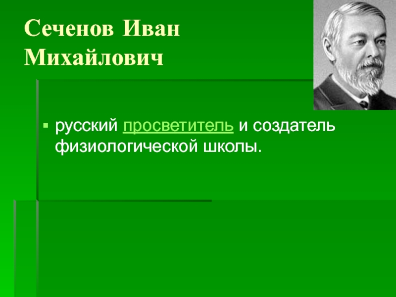 Сеченов Иван Михайловичрусский просветитель и создатель физиологической школы.