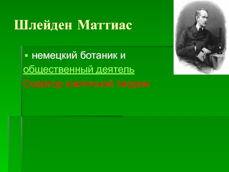 Шлейден Маттиаснемецкий ботаник и общественный деятель Соавтор клеточной теории