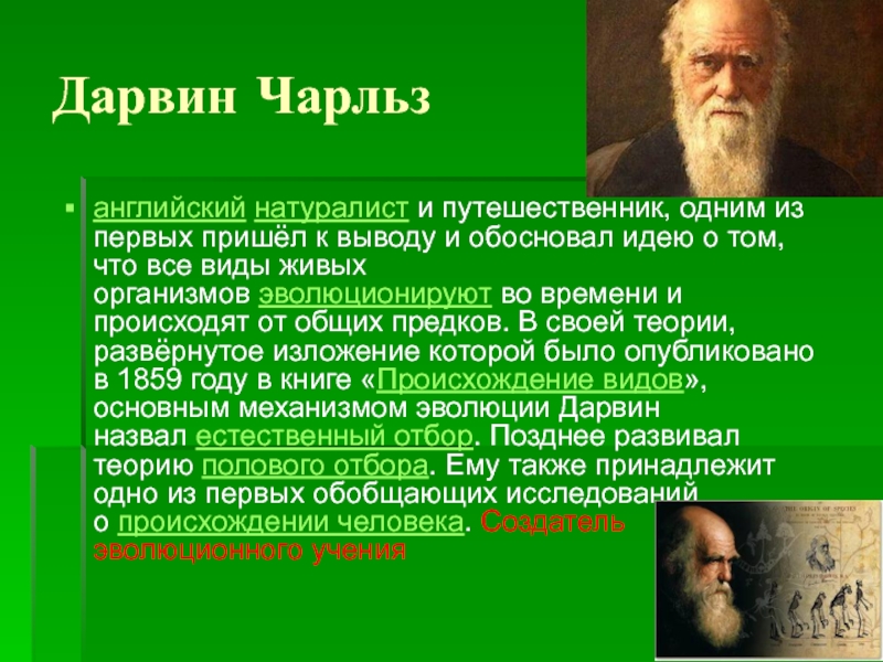 и происходят от общих предков. В своей теории, развёрнутое изложение которой было опубликовано в 1859 году в книге «Происхождение видов», основным механизмом эволюции Дарвин назвал естественный отбор. Позднее развивал теорию полового отбора. Ему также принадлежит одно из первых обобщающих исследований о происхождении человека. Создатель эволюционного учения