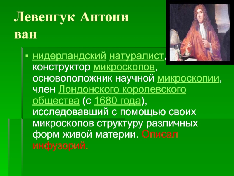 Левенгук Антони  ваннидерландский натуралист, конструктор микроскопов, основоположник научной микроскопии, член Лондонского королевского общества (с 1680 года), исследовавший с помощью своих микроскопов структуру различных