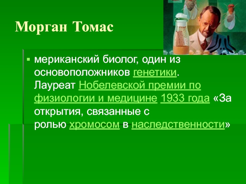 Морган Томасмериканский биолог, один из основоположников генетики. Лауреат Нобелевской премии по физиологии и медицине 1933 года «За открытия, связанные с ролью хромосом в наследственности»