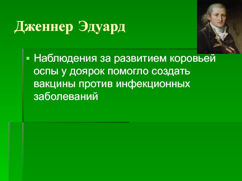 Дженнер ЭдуардНаблюдения за развитием коровьей оспы у доярок помогло создать вакцины против инфекционных заболеваний