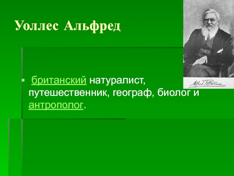 Уоллес Альфред британский натуралист, путешественник, географ, биолог и антрополог.