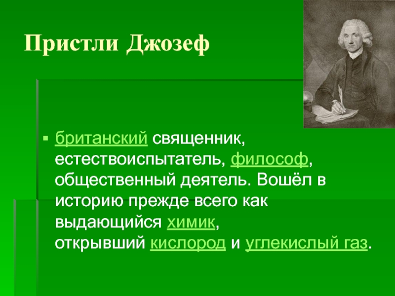 Пристли Джозефбританский священник, естествоиспытатель, философ, общественный деятель. Вошёл в историю прежде всего как выдающийся химик, открывший кислород и углекислый газ.