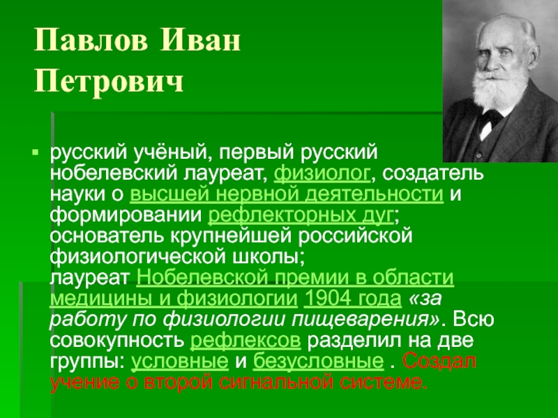 премии в области медицины и физиологии 1904 года «за работу по физиологии пищеварения». Всю совокупность рефлексов разделил на две группы: условные и безусловные . Создал учение о второй сигнальной системе.