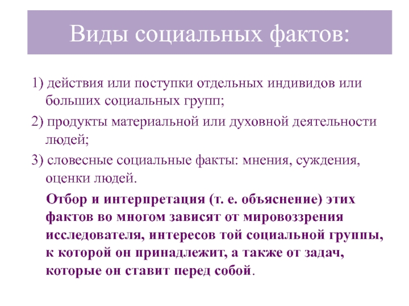Отбор и интерпретация (т. е. объяснение) этих фактов во многом зависят от мировоззрения исследователя, интересов той социальной группы, к которой он принадлежит, а также от задач, которые он ставит перед собой.