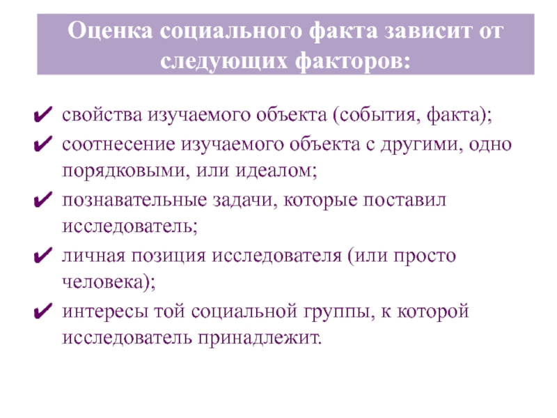 Слайд 52Оценка социального факта зависит от следующих факторов: