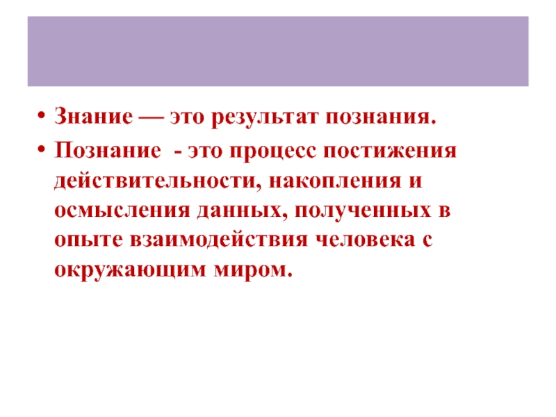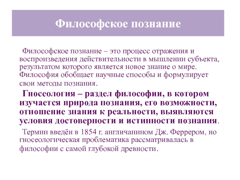 Гносеология – раздел философии, в котором изучается природа познания, его возможности, отношение знания к реальности, выявляются условия достоверности и истинности познания.