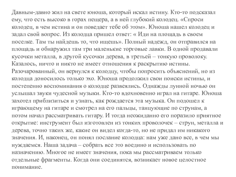 глубокий колодец. «Спроси колодец, в чем истина и он поведает тебе об этом». Юноша нашел колодец и задал свой вопрос. Из колодца пришел ответ: « Иди на площадь в своем поселке. Там ты найдешь то, что ищешь». Полный надежд, он отправился на площадь и обнаружил там три маленькие торговые лавки. В одной продавали кусочки металла, в другой кусочки дерева, в третьей – тонкую проволоку. Казалось, ничто и никто не имеет отношения к раскрытию истины. Разочарованный, он вернулся к колодцу, чтобы попросить объяснений, но из колодца доносилось только эхо. Юноша продолжил свои поиски истины, и постепенно воспоминания о колодце развеялись. Однажды лунной ночью он услышал звуки чудесной музыки. Кто-то вдохновенно играл на гитаре. Юноша захотел приблизиться и узнать, как рождается эта музыка. Он подошел к играющему на гитаре и смотрел на его пальцы, танцующие по струнам, а потом начал рассматривать гитару. И тогда неожиданно его поразило приятное открытие: инструмент был изготовлен из тонких проволочек – струн, металла и дерева, точно таких же, какие он видел когда-то, но не придал им никакого значения. И, наконец, он понял послание колодца: нам уже дано все, в чем мы нуждаемся. Наша задача – собрать все это воедино и использовать по назначению. Многое не имеет значения, пока мы рассматриваем только отдельные фрагменты. Когда они соединятся, возникает новое целостное понимание.