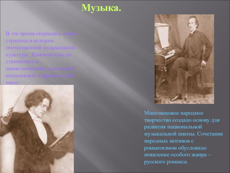 Многовековое народное творчество создало основу для развития национальной музыкальной школы. Сочетание народных мотивов с романтизмом обусловило появление особого жанра – русского романса.