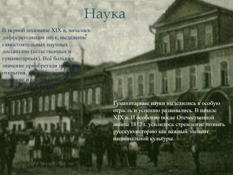 Гуманитарные науки выделились в особую отрасль и успешно развивались. В начале ХIХ в. И особенно после Отечественной войны 1812 г. усилилось стремление познать русскую историю как важный элемент национальной культуры.