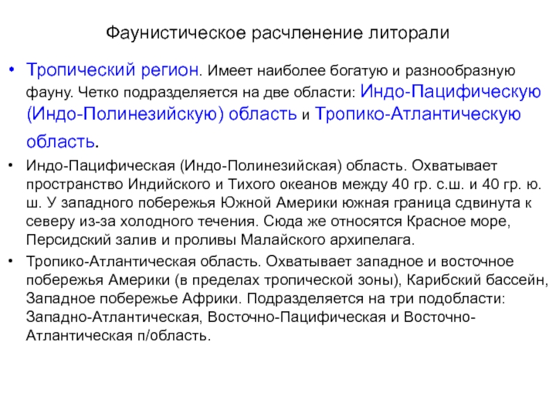 Тропико-Атлантическая область. Охватывает западное и восточное побережья Америки (в пределах тропической зоны), Карибский бассейн, Западное побережье Африки. Подразделяется на три подобласти: Западно-Атлантическая, Восточно-Пацифическая и Восточно-Атлантическая п/область.