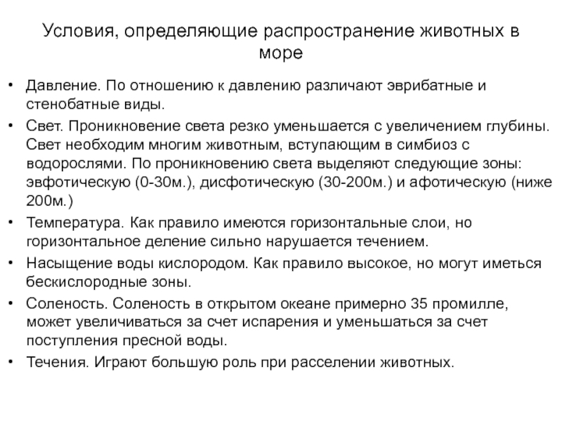 увеличением глубины. Свет необходим многим животным, вступающим в симбиоз с водорослями. По проникновению света выделяют следующие зоны: эвфотическую (0-30м.), дисфотическую (30-200м.) и афотическую (ниже 200м.)