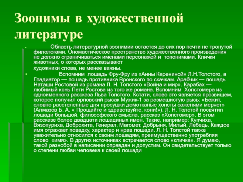 Область литературной зоонимии остается до сих пор почти не