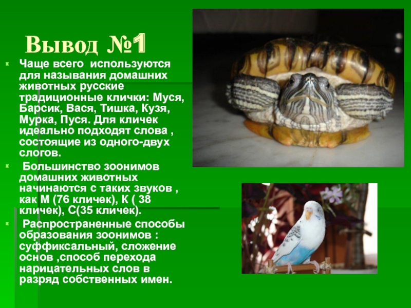Распространенные способы образования зоонимов :суффиксальный, сложение основ ,способ перехода нарицательных слов в разряд собственных имен.