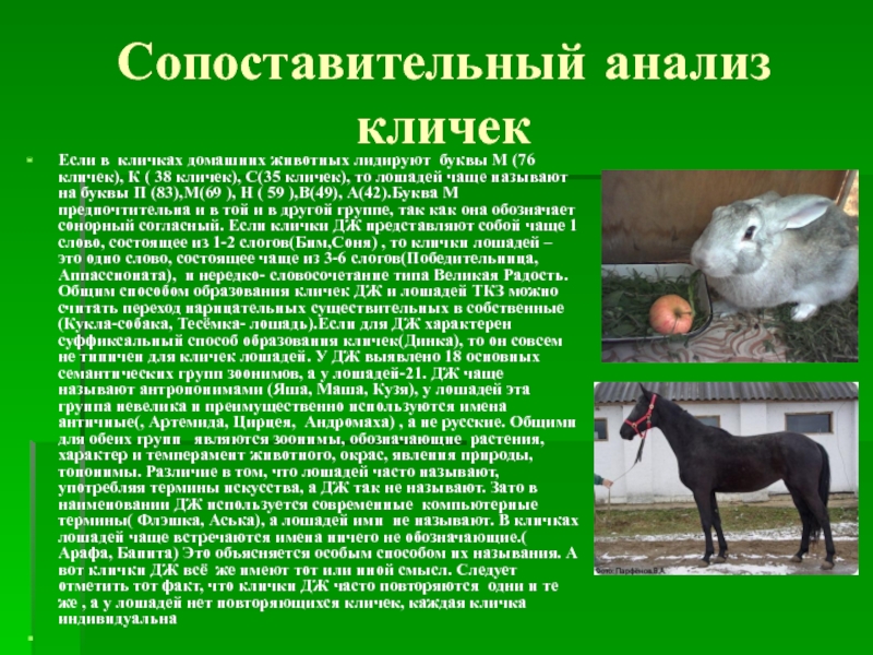 лошадей чаще называют на буквы П (83),М(69 ), Н ( 59 ),В(49), А(42).Буква М предпочтительна и в той и в другой группе, так как она обозначает сонорный согласный. Если клички ДЖ представляют собой чаще 1 слово, состоящее из 1-2 слогов(Бим,Соня) , то клички лошадей – это одно слово, состоящее чаще из 3-6 слогов(Победительница, Аппассионата), и нередко- словосочетание типа Великая Радость. Общим способом образования кличек ДЖ и лошадей ТКЗ можно считать переход нарицательных существительных в собственные (Кукла-собака, Тесёмка- лошадь).Если для ДЖ характерен суффиксальный способ образования кличек(Динка), то он совсем не типичен для кличек лошадей. У ДЖ выявлено 18 основных семантических групп зоонимов, а у лошадей-21. ДЖ чаще называют антропонимами (Яша, Маша, Кузя), у лошадей эта группа невелика и преимущественно используются имена античные(, Артемида, Цирцея, Андромаха) , а не русские. Общими для обеих групп являются зоонимы, обозначающие растения, характер и темперамент животного, окрас, явления природы, топонимы. Различие в том, что лошадей часто называют, употребляя термины искусства, а ДЖ так не называют. Зато в наименовании ДЖ используется современные компьютерные термины( Флэшка, Аська), а лошадей ими не называют. В кличках лошадей чаще встречаются имена ничего не обозначающие.( Арафа, Бапита) Это объясняется особым способом их называния. А вот клички ДЖ всё же имеют тот или иной смысл. Следует отметить тот факт, что клички ДЖ часто повторяются одни и те же , а у лошадей нет повторяющихся кличек, каждая кличка индивидуальна