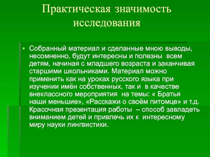 заканчивая старшими школьниками. Материал можно применить как на уроках русского языка при изучении имён собственных, так и в качестве внеклассного мероприятия на темы: « Братья наши меньшие», «Расскажи о своём питомце» и т.д. Красочная презентация работы – способ завладеть вниманием детей и привлечь их к интересному миру науки лингвистики.