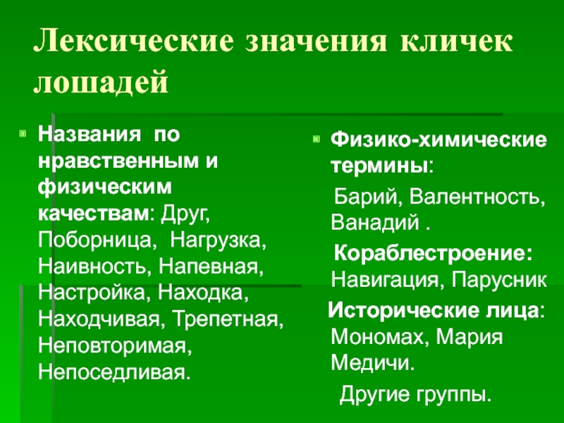 Слайд 21Лексические значения кличек лошадей