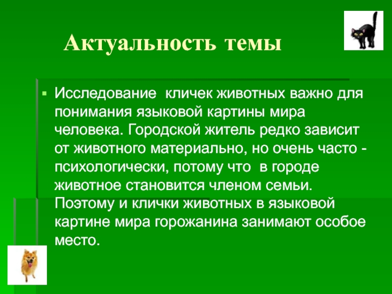 материально, но очень часто - психологически, потому что в городе животное становится членом семьи. Поэтому и клички животных в языковой картине мира горожанина занимают особое место.
