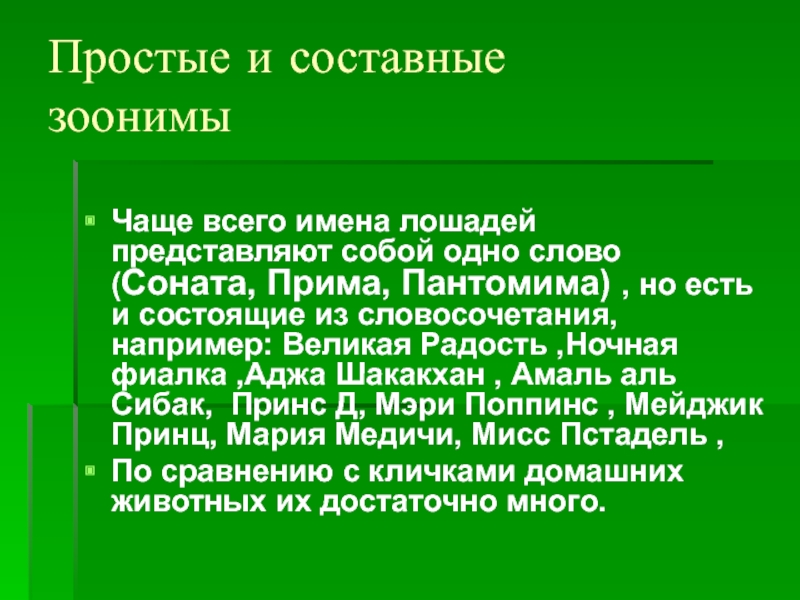 всего имена лошадей представляют собой одно слово (Соната, Прима, Пантомима) , но есть и состоящие из словосочетания, например: Великая Радость ,Ночная фиалка ,Аджа Шакакхан , Амаль аль Сибак, Принс Д, Мэри Поппинс , Мейджик Принц, Мария Медичи, Мисс Пстадель ,