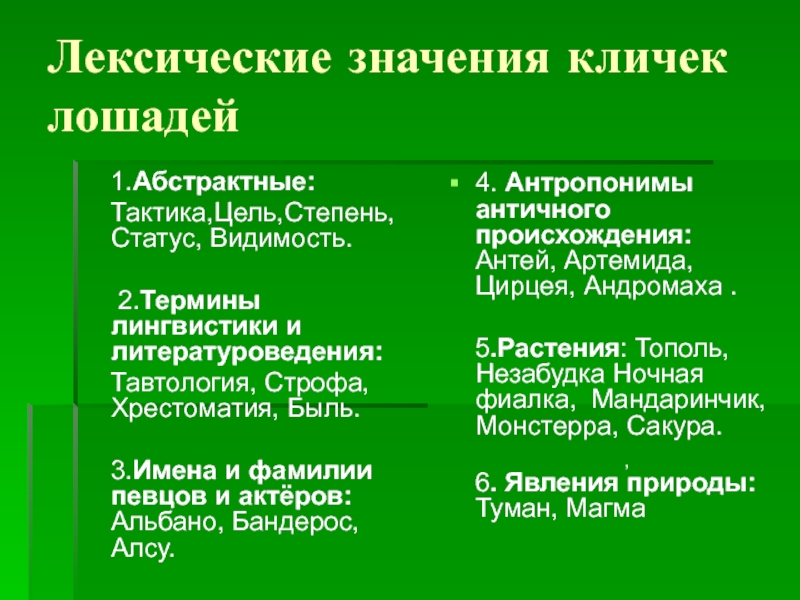 Слайд 23Лексические значения кличек лошадей