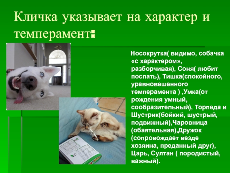 собачка «с характером», разборчивая), Соня( любит поспать), Тишка(спокойного, уравновешенного темперамента