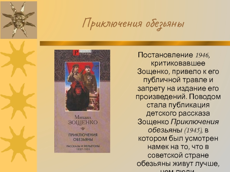 рассказа Зощенко Приключения обезьяны (1945), в котором был усмотрен намек на то, что в советской стране обезьяны живут лучше, чем люди.