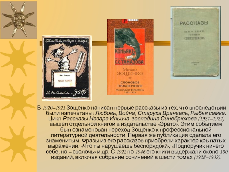 Назара Ильича, господина Синебрюхова (1921–1922) вышел отдельной книгой в издательстве «Эрато». Этим событием был ознаменован переход Зощенко к профессиональной литературной деятельности. Первая же публикация сделала его знаменитым. Фразы из его рассказов приобрели характер крылатых выражений: «Что ты нарушаешь беспорядок?»; «Подпоручик ничего себе, но – сволочь» и др. С 1922 по 1946 его книги выдержали около 100 изданий, включая собрание сочинений в шести томах (1928–1932).