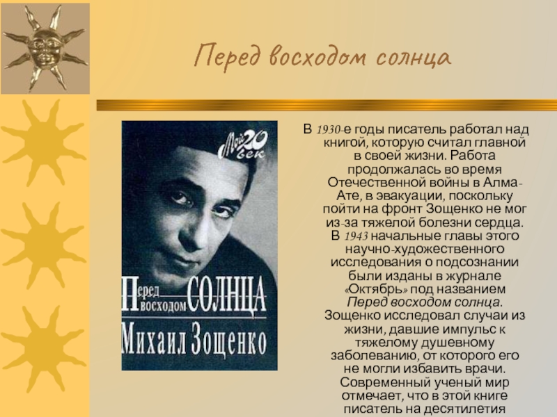 войны в Алма-Ате, в эвакуации, поскольку пойти на фронт Зощенко не мог из-за тяжелой болезни сердца. В 1943 начальные главы этого научно-художественного исследования о подсознании были изданы в журнале «Октябрь» под названием Перед восходом солнца. Зощенко исследовал случаи из жизни, давшие импульс к тяжелому душевному заболеванию, от которого его не могли избавить врачи. Современный ученый мир отмечает, что в этой книге писатель на десятилетия предвосхитил многие открытия науки о бессознательном.
