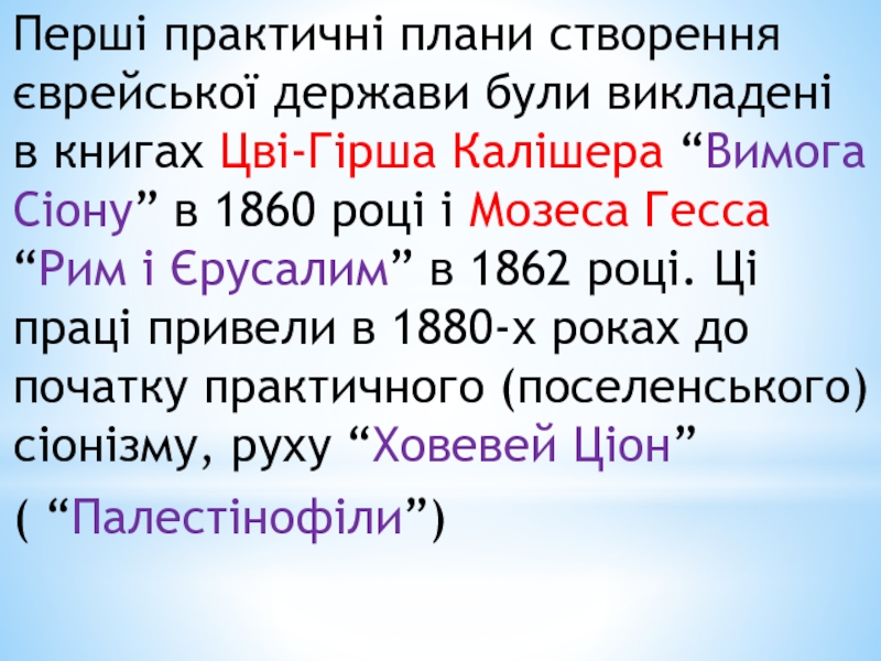 Перші практичні плани створення єврейської держави були викладені в книгах Цві-Гірша Калішера “Вимога Сіону” в 1860 році