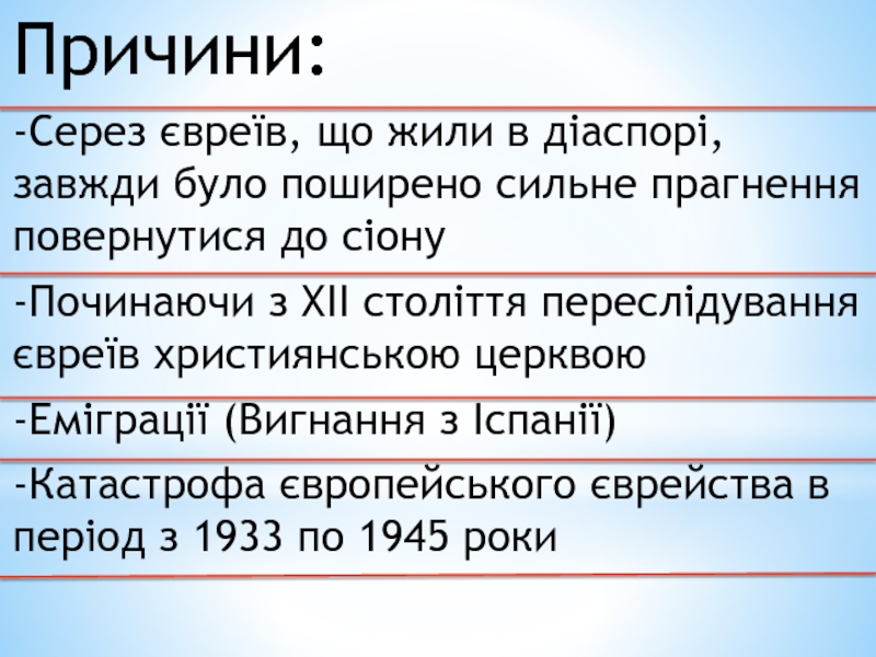 Причини:-Серез євреїв, що жили в діаспорі, завжди було поширено сильне прагнення повернутися до сіону-Починаючи з XII століття