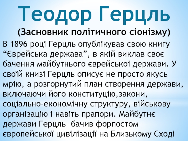 Теодор Герцль (Засновник політичного сіонізму) В 1896 році Герцль опублікував свою книгу “Єврейська держава”, в якій виклав