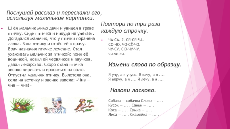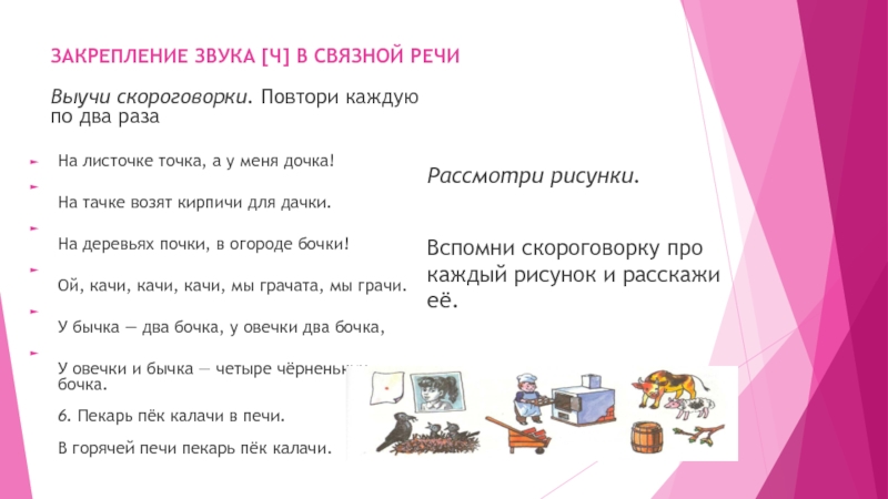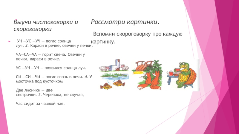 Вспомни скороговорку про каждый рисунок и расскажи её.