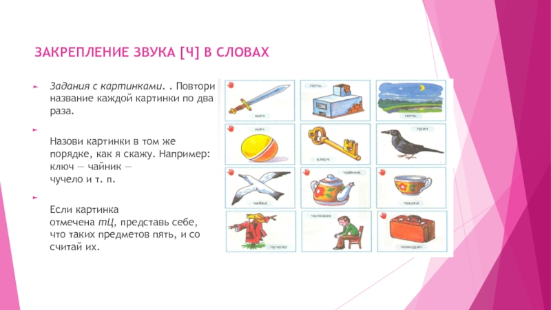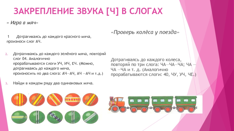 Дотрагиваясь до каждого колеса, повторяй по три слога: ЧА—ЧА—ЧА; ЧА —ЧА —ЧА и т. д. (Аналогично прорабатываются слоги: 40, ЧУ, УЧ, ЧЕ.)