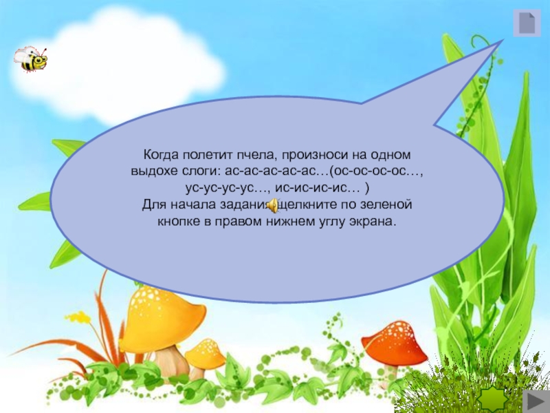 Когда полетит пчела, произноси на одном выдохе слоги: ас-ас-ас-ас-ас…(ос-ос-ос-ос…,ус-ус-ус-ус…, ис-ис-ис-ис… )Для начала задания щелкните по зеленой кнопке