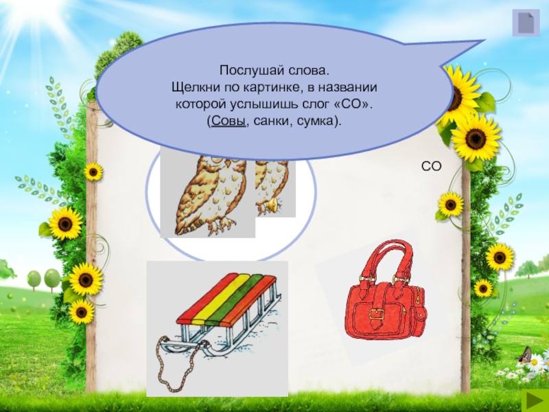 Послушай слова.Щелкни по картинке, в названии которой услышишь слог «СО».(Совы, санки, сумка).СО